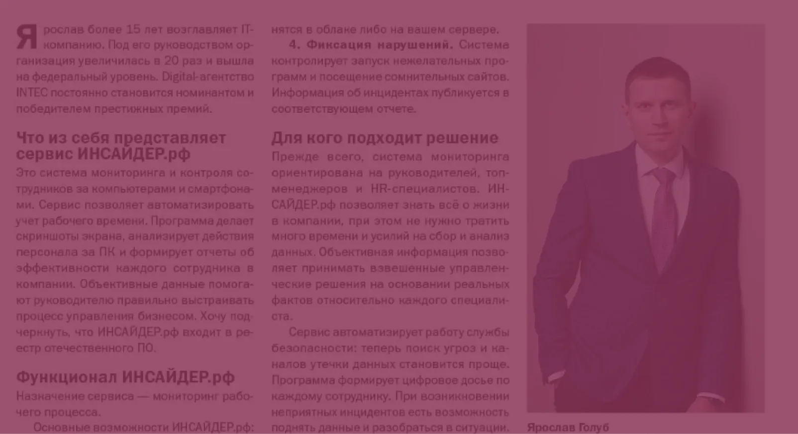Это система мониторинга и контроля сотрудников за компьютерами и смартфонами. Сервис позволяет автоматизировать учет рабочего времени. Программа делает скриншоты экрана, анализирует действия персонала за ПК и формирует отчеты об эффективности каждого сотрудника в компании. Объективные данные помогают руководителю правильно выстраивать процесс управления бизнесом. Хочу подчеркнуть, что ИНСАЙДЕР.рф входит в реестр отечественного ПО.