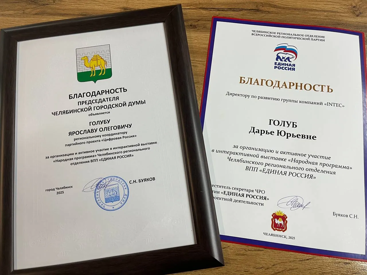Директор INTEC Ярослав Голуб, который также является региональным координатором проекта ЕР «Цифровая Россия», и Дарья Голуб — директор по развитию INTEC и исполнительный директор Ассоциации ИТ-компаний Челябинской области, получили благодарственную грамоту за организацию и активное участие в интерактивной выставке «Народная программа» от Буякова Сергея Николаевича — Председателя Челябинской городской Думы и зам. Секретаря по партпроектам ЕР.