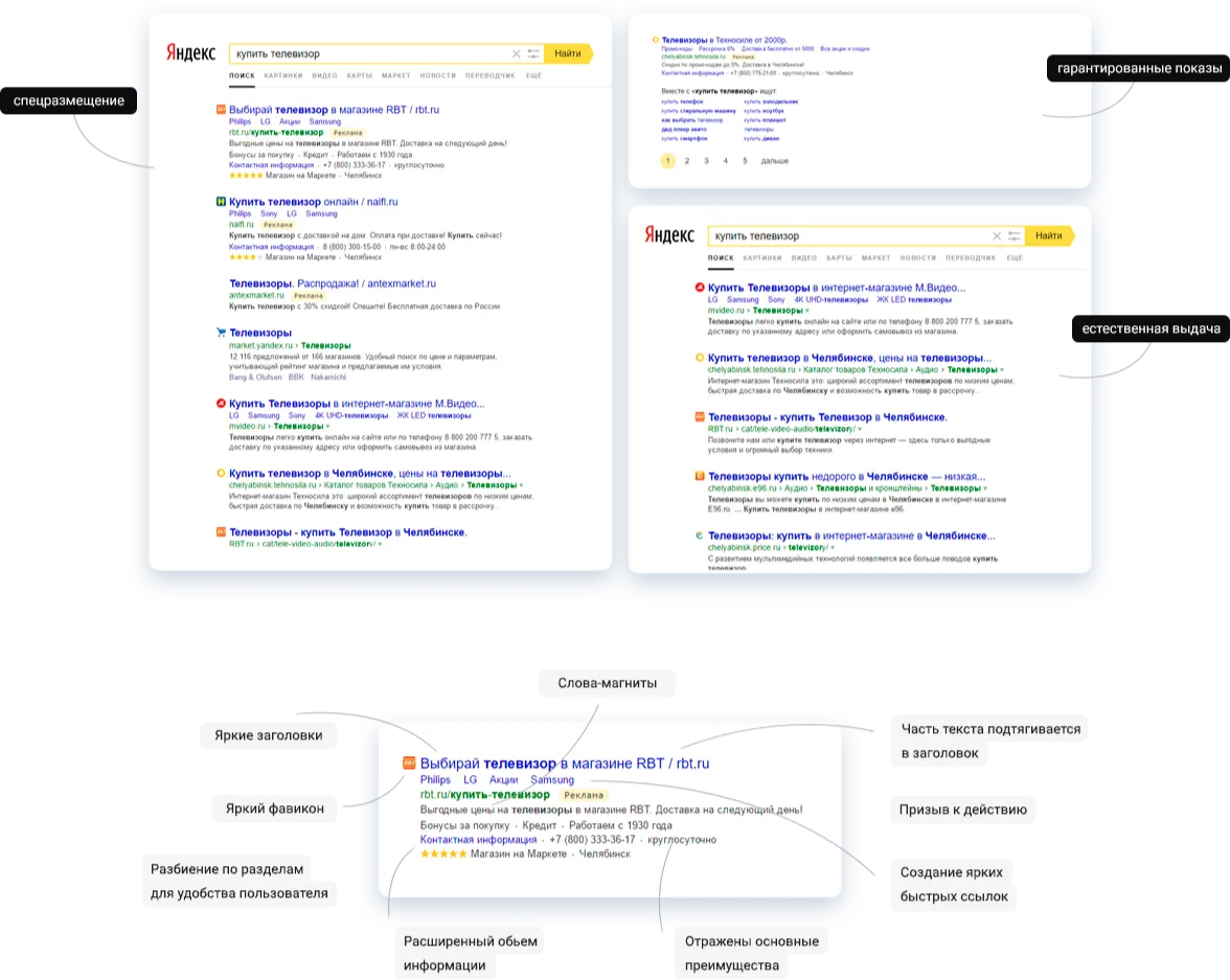 Проведение рекламных кампаний в поиске Яндекса, сети поисковых и тематических партнеров. Максимальный охват рунета