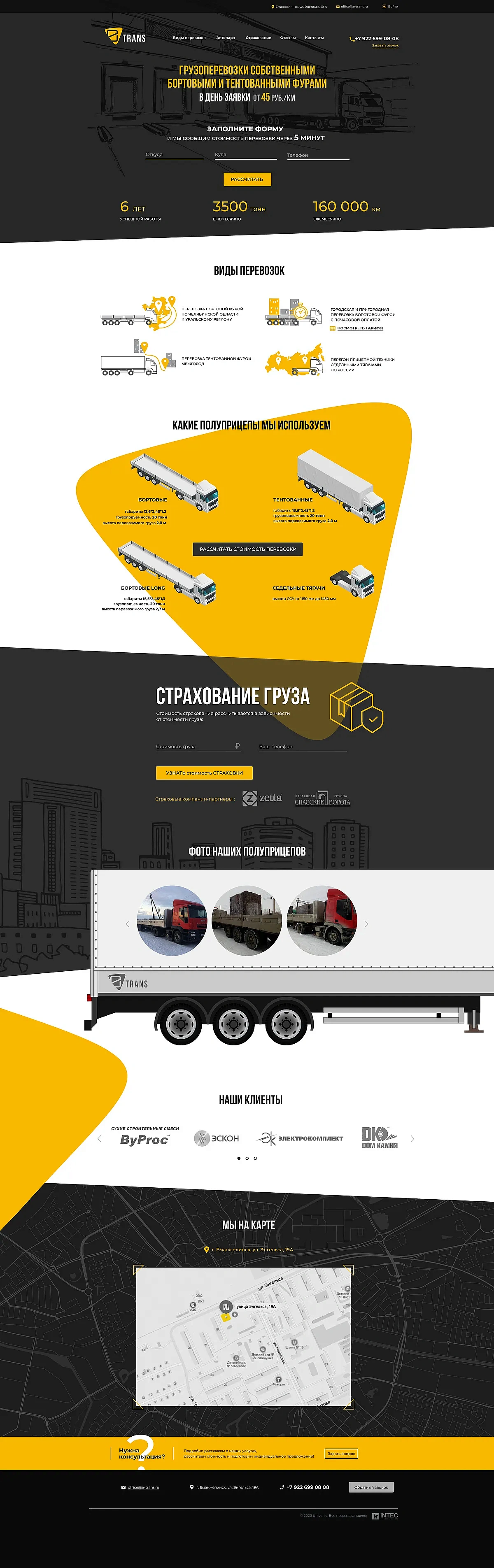 Для реализации лендинга заказчик выбрал INTEC UniBOX. В готовом решении привлекло простое управление, возможность быстрого запуска, удобство и наличие необходимого функционала. Акцент сделан на ключевые преимущества компании, особенности и отличия от конкурентов. Были внедрены различные лид-магниты в виде калькуляторов расчета перевозок и страхования для удобства посетителей и увеличения количества заявок.