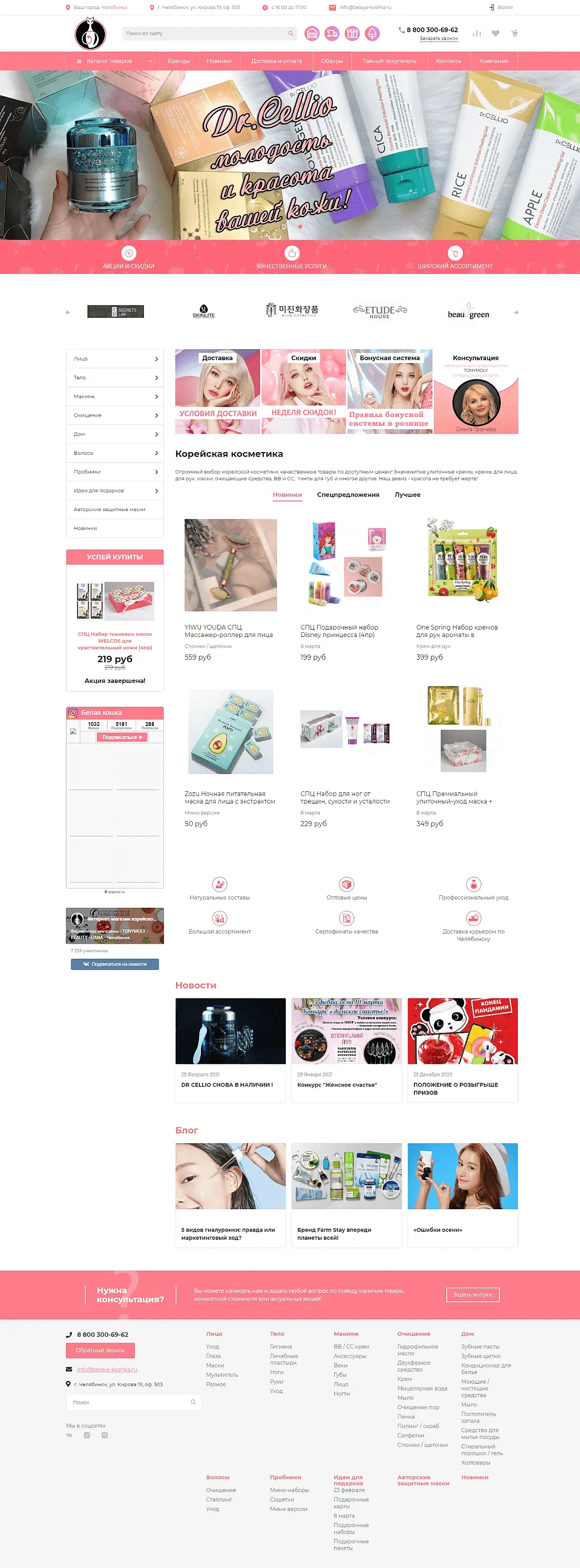 Для сайта «Белая кошка» был разработан эксклюзивный дизайн в фирменном стиле компании. На главную страницу вынесены блоки с акциями и новостями, а также карусели популярных товаров и новинок. Для заполнения каталога товаров была проведена интеграция сайта с 1С.