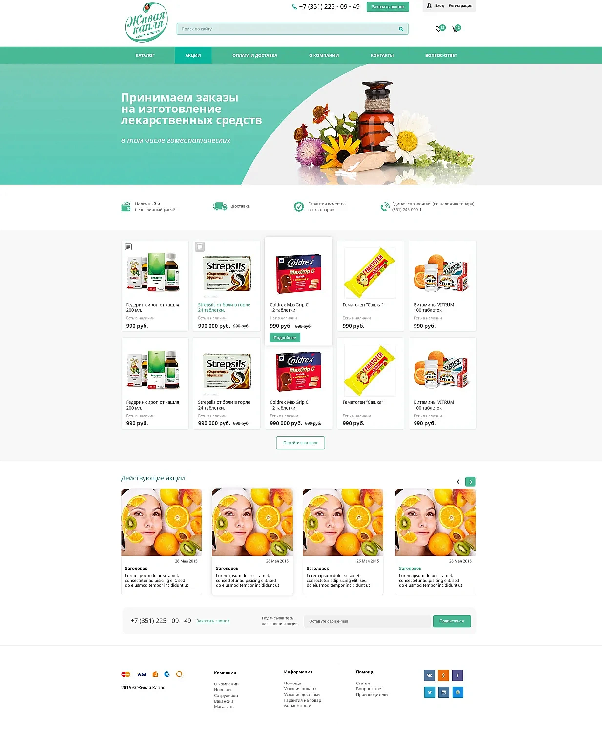 Сайт сети аптек "Живая капля" реализован как интернет-магазин лекарственных товаров. Была произведена доработка корзины, для того, чтобы получить необходимый функционал: возможность распечатки заказов и отображение сэкономленной суммы (если применяется скидка). Весь сайт выполнен в фирменном стиле компании.