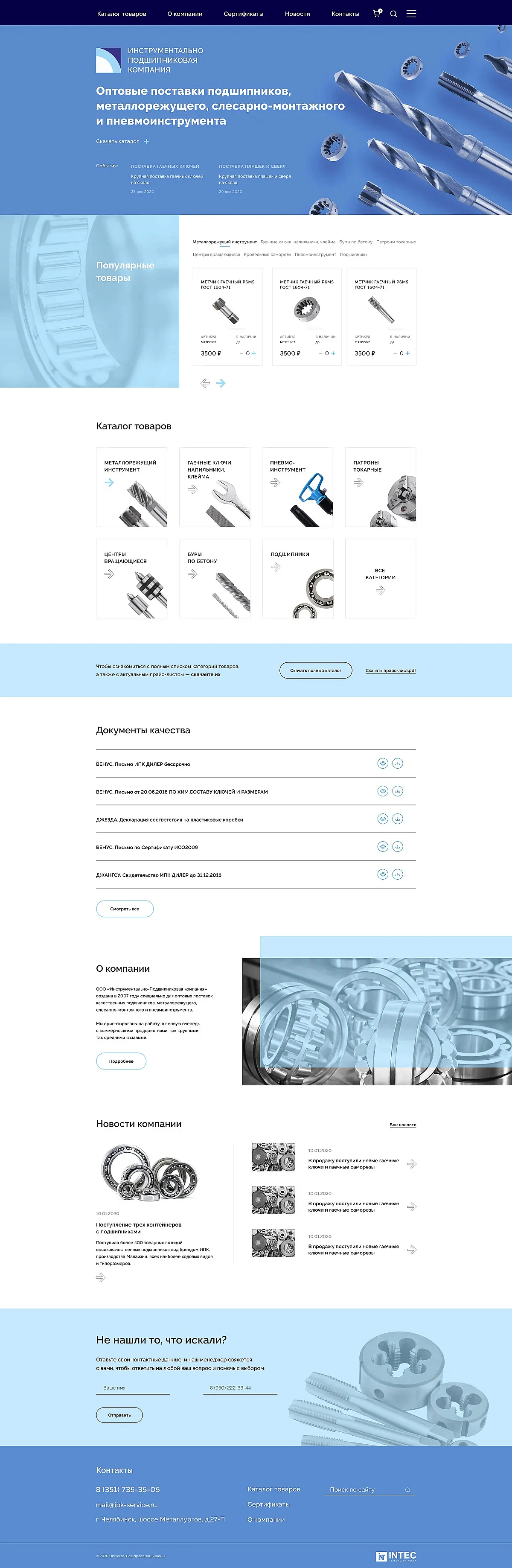 Для разработки сайта мы выбрали готовое решение INTEC.Prom — это сайт промышленной компании и оптового поставщика с B2B кабинетом и интернет-магазином. Выбор был обусловлен наличием готового набора функционала и большого числа полезных модулей. Дизайн выполнен в бело-сине-голубой холодной цветовой гамме. Цветовая схема взята с логотипа заказчика. Основа — это голубой цвет, отражающий доверие, безопасность и надежность. Голубой цвет хорошо гармонирует со стальным цветом фотографий продукции. Основной цвет сайта — белый, он хорошо сочетается с любым оттенком, в том числе голубым. Белый цвет дает отдохнуть глазам,  делает дизайн чистым, позволяет сосредоточиться на важных элементах страницы. Шрифт современный, без засечек, удобен в чтении.