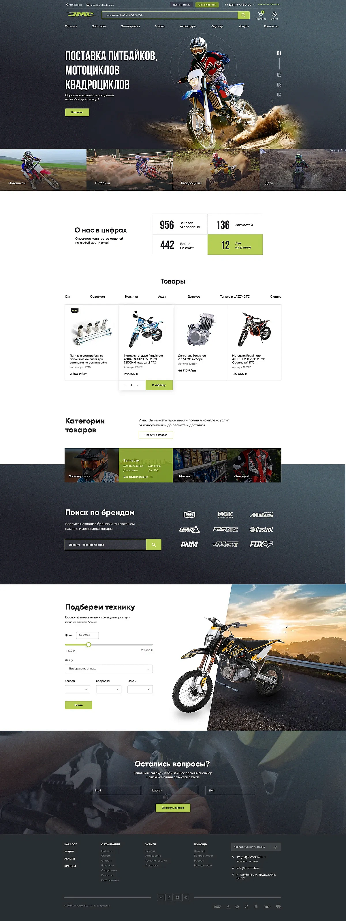 Разрабатывая сайт, мы сделали акцент на поисковой строке и популярных категориях. Мню лаконичное и понятное — для облегчения поиска. Отдельно разработана карточка товара специально под задачи заказчика. Цветовая схема взята с логотипа заказчика. Темный серый цвет — цвет асфальта, бездорожья, резины колес. Отлично подходит под тематику бизнеса заказчика. Зеленый цвет — для акцентов.