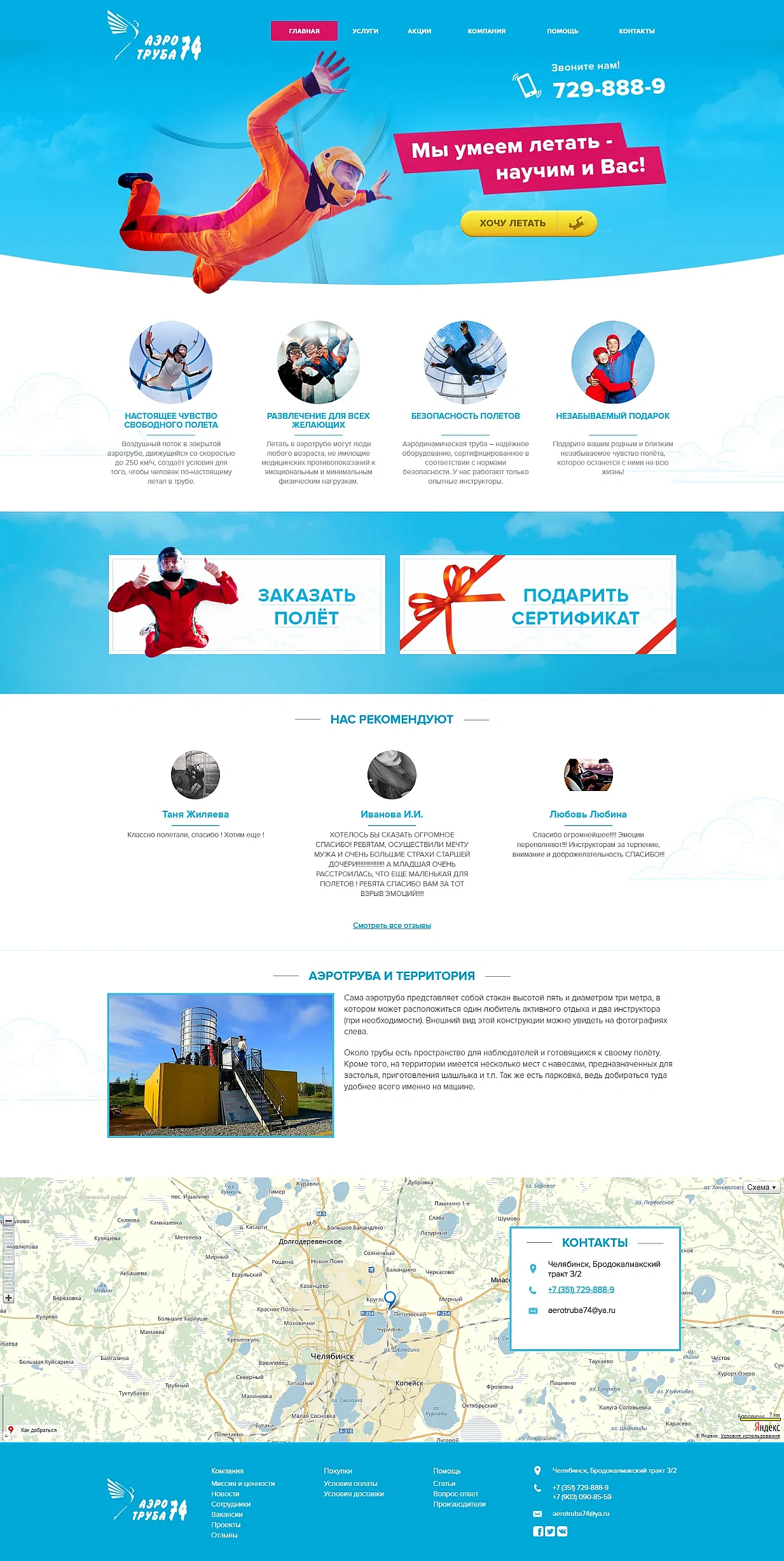 Для компании "Аэротруба" был создан корпоративный сайт с услугами на решении UniSite. Фишкой сайта является баннер на главной странице: он необычной формы, а также благодаря анимации создается эффект "парения" человека. Также на сайте реализована возможность онлайн-записи на полет в аэротрубе.