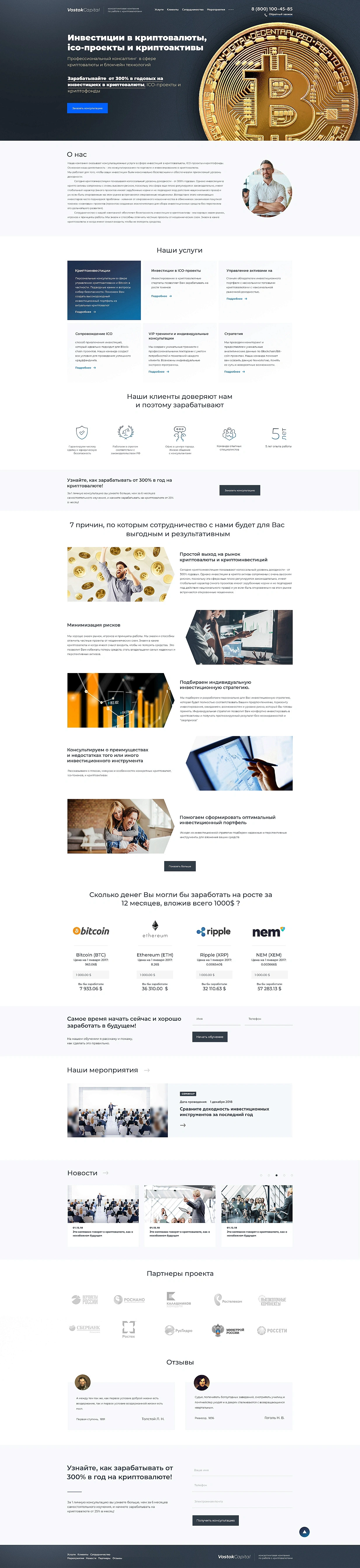 Для компании "VostokCapital" был разработан индивидуальный дизайн главной страницы, с учетом требования отрасли рынка криптовалют.