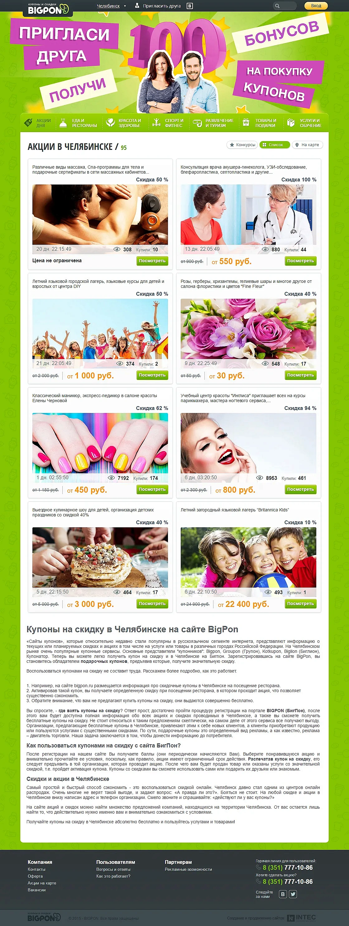 Уникальный сайт купонов "Bigpon" был разработан на CMS-системе 1С-Битрикс как полностью эксклюзивный сайт. Предусмотрены все основные возможности аналогичных сайтов: карточка акции, регистрация и система бонусов, а также системы обратного отсчета до конца акции.