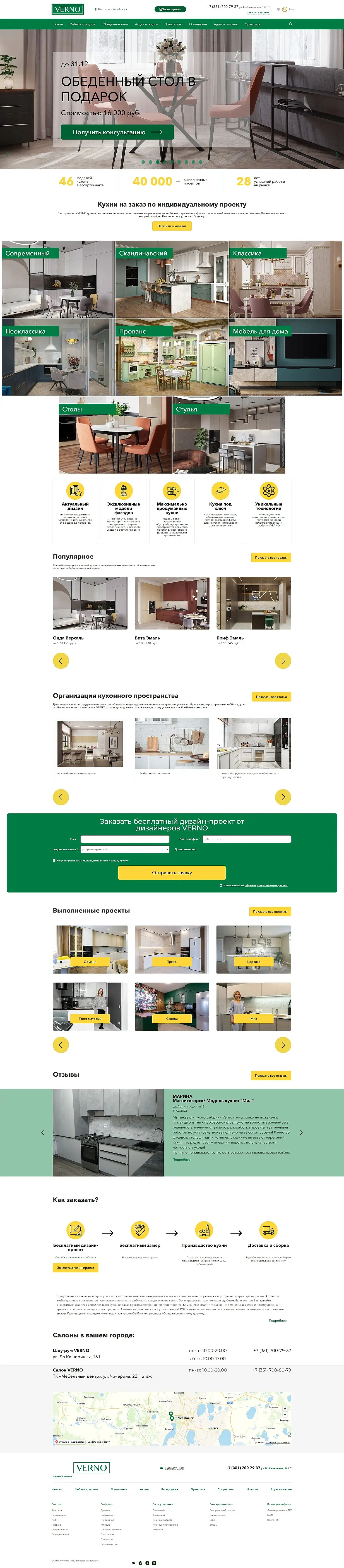 Компания не только продает кухни, у нее еще есть собственное производство, знаки качества и награды. Это важно было отразить уже на главной странице. Вот почему мы вынесли эту информацию на первый экран.