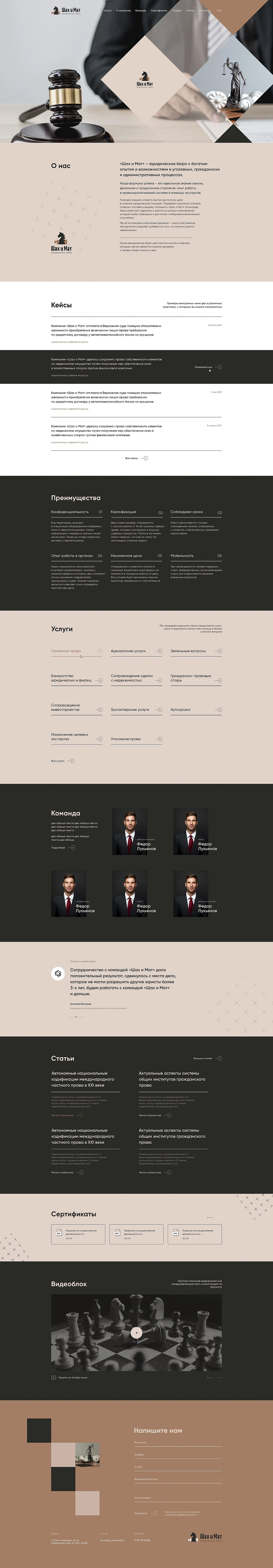 Создать сайт юридической компании представительского уровня, вызывающий доверие и обладающий своим собственным, неповторимым стилем. Компания специализируется на целом спектре юридических услуг, от семейных дел до арбитража. Необходимо было отобразить на сайте возможность компании "Шах и Мат" помочь в решении любого юридического вопроса. Так же, в концепции самой компании была заложена шахматная доска и шахматные фигуры. Необходимо было использовать эти визуальные решения при разработке фирменного стиля компании и дизайна сайта