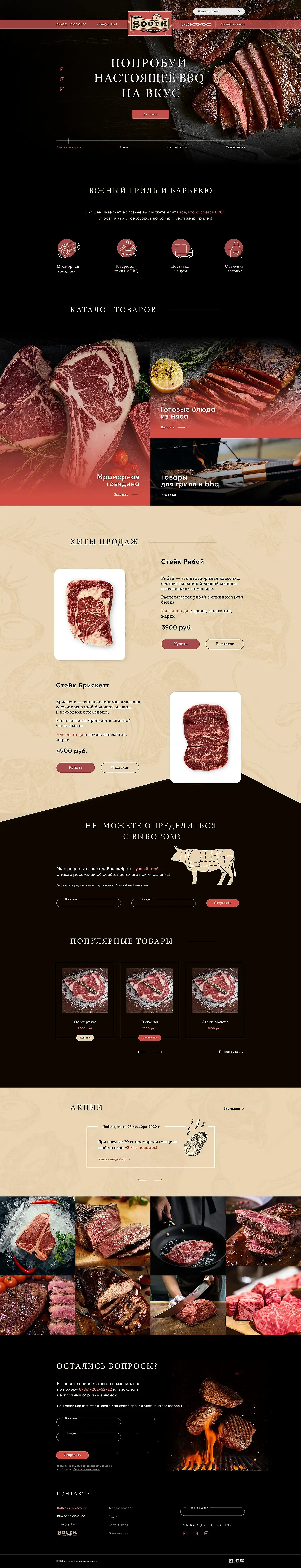 Задача сайта — повышение продаж продукции бренда. На сайте использованы качественные и вызывающие аппетит фотографии стейков мяса. Логотип, цвета и шрифты предоставил заказчик. Цветовая схема сайта отражает настроение бренда, это цвета поджаренного на гриле мяса, копчения и специй.