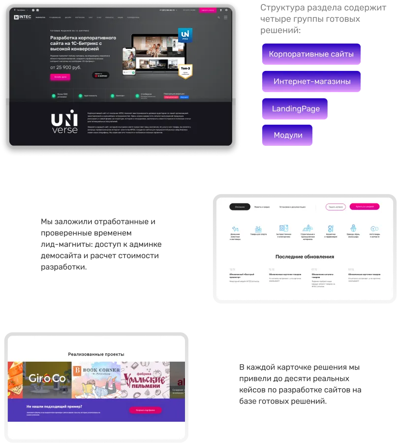Типовая карточка решения насчитывает более 15 блоков, каждый из которых раскрывает функциональные возможности, особенности дизайна и технические преимущества готового сайта.