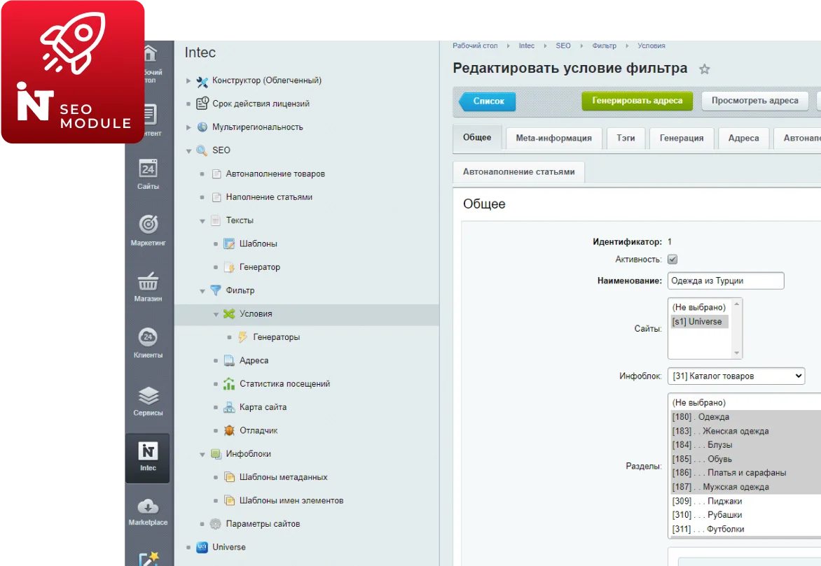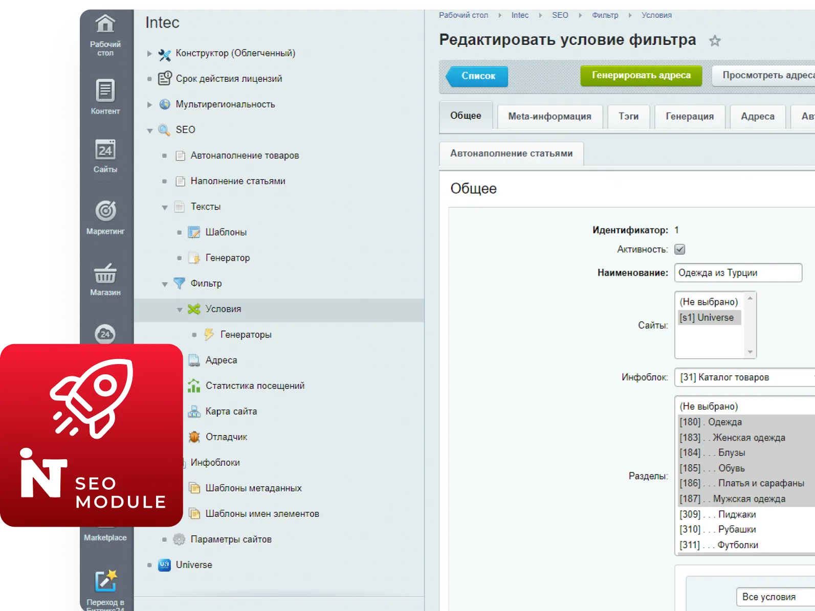 Модуль оснащен автогенератором уникальных текстов и SEO-фильтром, который позволяет гибко настраивать метаданные и автоматически создавать посадочные страницы для фильтров по товарам.