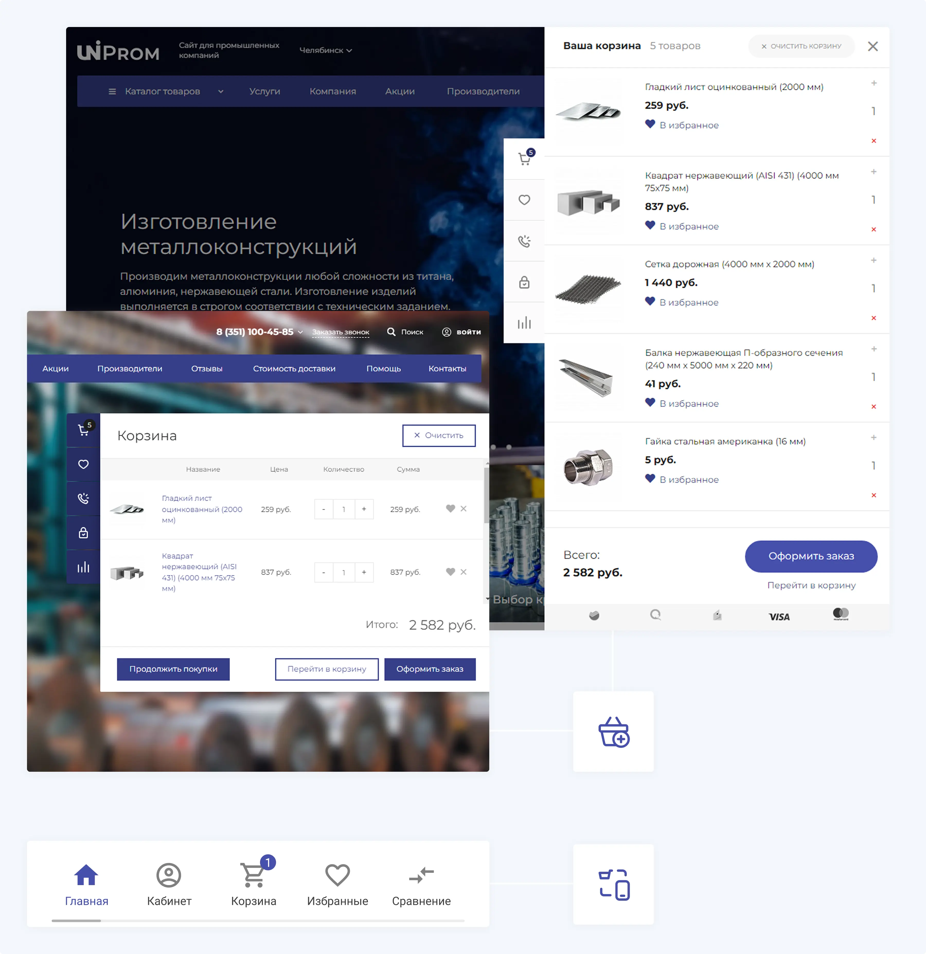 Корзина корректно отображается на любых устройствах — от десктопа до смартфона