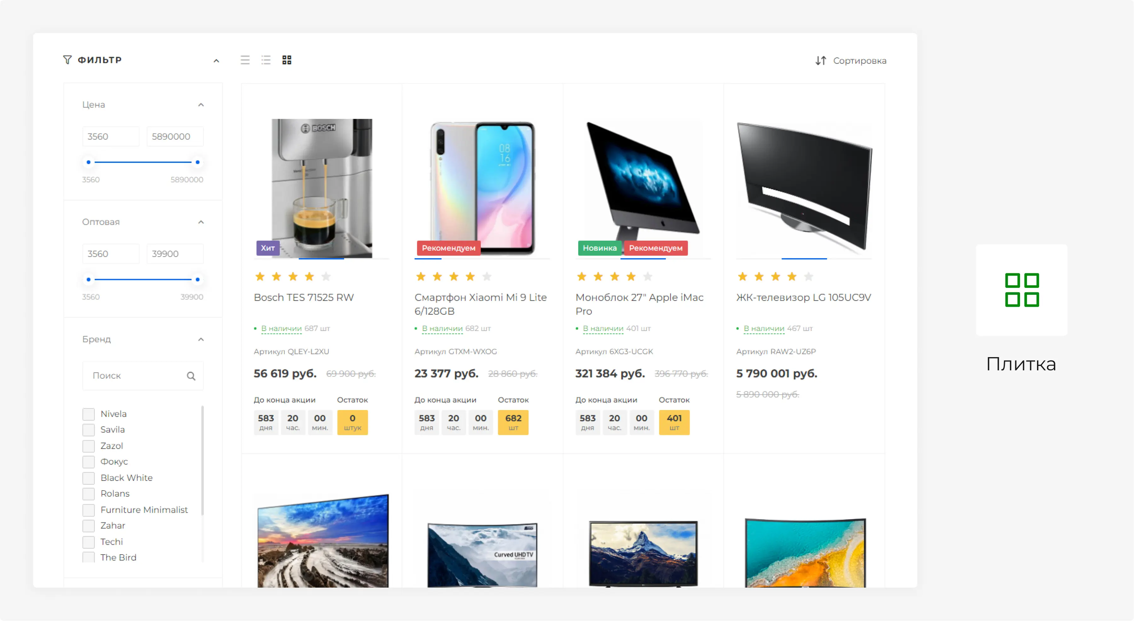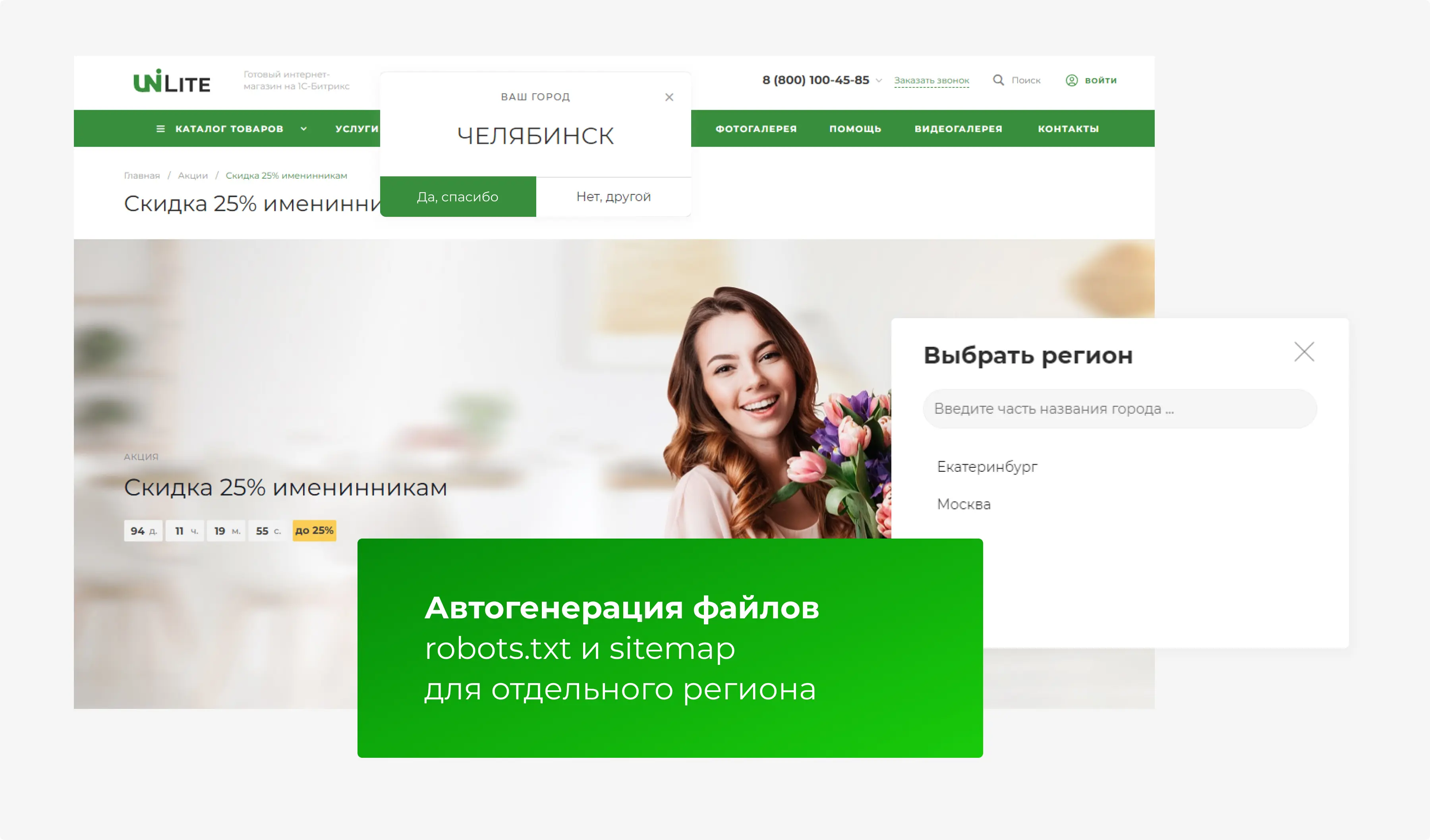 Модуль включает автогенератор уникальных текстов и SEO-фильтр, который позволяет настраивать мета-данные и создавать посадочные страницы для фильтрации товаров